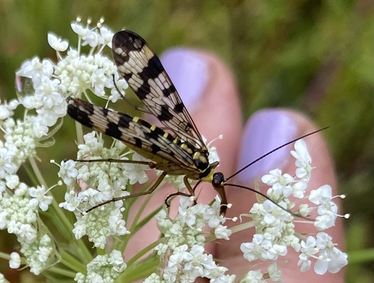 Skorpionsfliegen (Panorpidae) gehören zur Gruppe der Schnabelfliegen (Mecoptera), die durch ihre schnabelartig verlängerten Köpfe auffallen (Abb. 1). Die Skorpionsfliegenmännchen besitzen am Ende ihres aufwärts gebogenen Hinterleibs zudem eine Verdickung, die an den Hinterleibsstachel der namengebenden Gliederfüßer erinnert (Abb. 2). Es ist aber keine Waffe, sondern eine Art Zange: Damit greifen sie bei der Paarung von unten den Hinterleib des Weibchens, das sich dabei V-förmig versetzt über ihnen befindet.