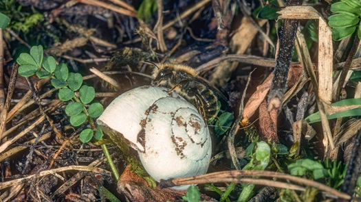 Wer diese spektakuläre Brutfürsorge auch selbst einmal beobachten möchte, kann auch schon bei sich im eigenen naturnah gestalteten Garten Glück haben, denn die zweifarbige Schneckenhausbiene ist trotz ihrer anspruchsvollen Nistgewohnheiten noch recht häufig anzutreffen und bis auf Schleswig-Holstein deutschlandweit verbreitet. Dabei dienen ihnen beispielsweise extensiv bewirtschaftete Magerrasen oder Weinbergbrachen als Lebensraum, in dem neben störungsfreien Nistplätzen auch ein breites Nahrungsangebot benötigt wird, das die Schneckenhausbiene als generalistische „polylektische“ Art mit nachgewiesen Blütenbesuchen aus 13 Pflanzenfamilien voll ausschöpfen kann.