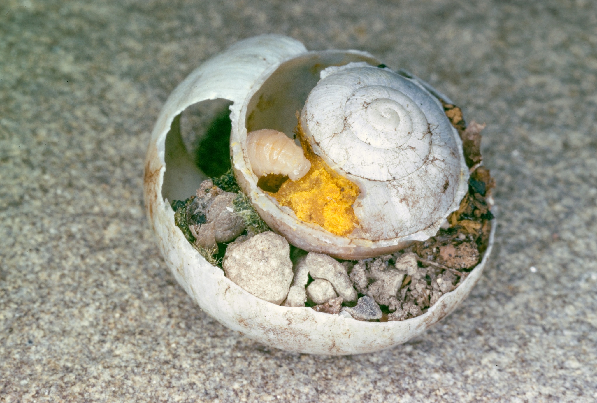 Abb. 4: Der Blick in das Schneckenhaus lässt erahnen, wie viel Mühe sich diese kleinen Bienen bei ihren Nestern geben: Ganz vorn ist der Vorrat an Nektar und Pollen, von dem sich die noch relativ kleine Larve ernährt. Anschließend bleibt ausreichend Platz für den Nachwuchs, um sich mehrmals zu häuten und letzten Endes zu verpuppen. Der Rest des Hauses wird akribisch verbarrikadiert, so ist die Larve sicher.Foto: A. Krebs