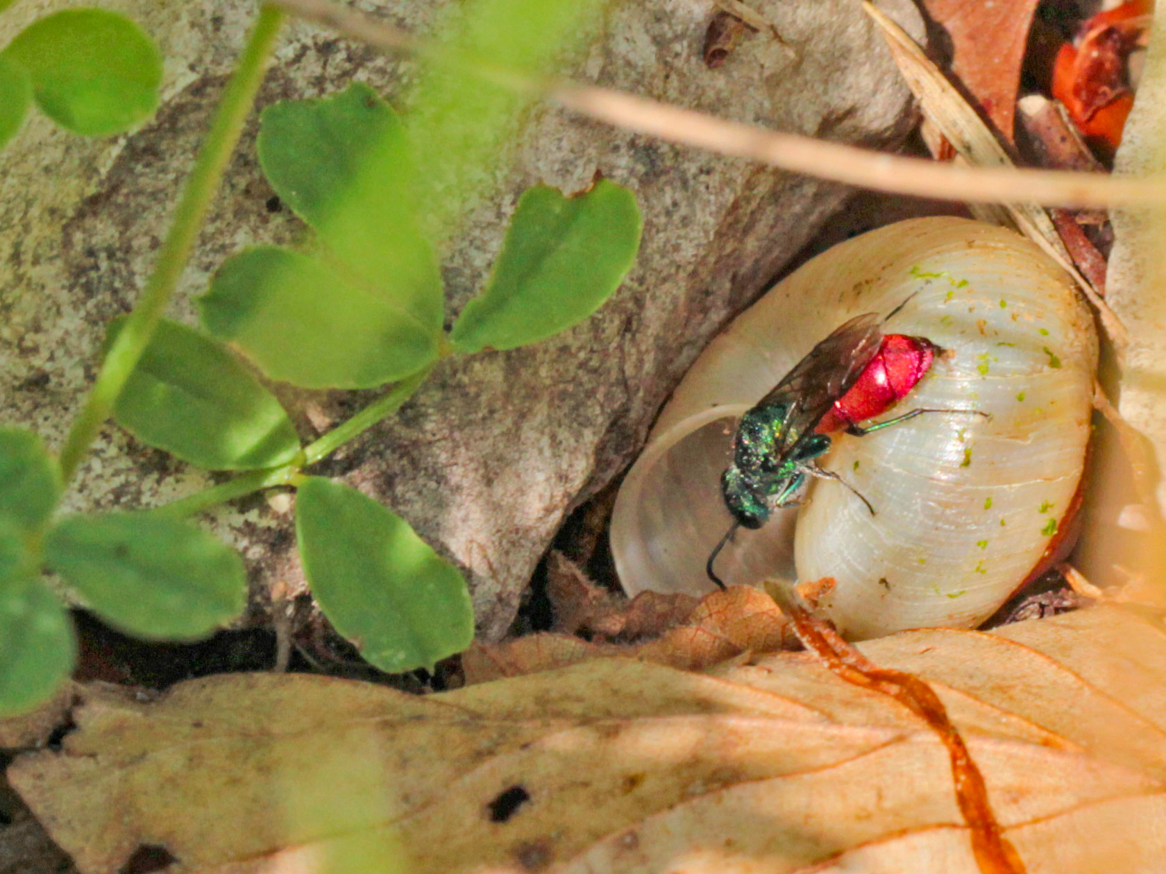 Abb. 5: Die parasitische Schneckenhausgoldwespe (Chrysura trimaculata) versucht, in das Schneckenhaus einzudringen, um ihr eigenes Ei ins Innere zu legen. Der Parasit ernährt sich dann von der Bienenlarve. Pech für die Biene, Glück für die Wespe. Dies ist ein ganz natürlicher Prozess, der auch nicht aufgehalten werden muss. Auch die schöne Goldwespe ist ein wichtiger Teil des Ökosystems. Foto: R. BüchiLinks und Literatur zum direkt Nachlesen