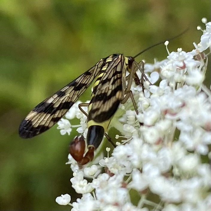 Skorpionsfliegen (Panorpidae) gehören zur Gruppe der Schnabelfliegen (Mecoptera), die durch ihre schnabelartig verlängerten Köpfe auffallen (Abb. 1). Die Skorpionsfliegenmännchen besitzen am Ende ihres aufwärts gebogenen Hinterleibs zudem eine Verdickung, die an den Hinterleibsstachel der namengebenden Gliederfüßer erinnert (Abb. 2). Es ist aber keine Waffe, sondern eine Art Zange: Damit greifen sie bei der Paarung von unten den Hinterleib des Weibchens, das sich dabei V-förmig versetzt über ihnen befindet.