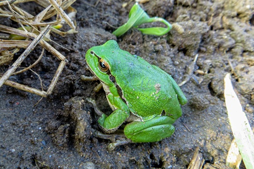 Hyla arborea – klingt wie eine Schlange, oder? Hinter diesem wissenschaftlichen Namen steckt allerdings der harmlose, nur 3 bis 5 Zentimeter große, Europäische Laubfrosch. Er unterscheidet sich von anderen heimischen Fröschen durch seine auffallend hellgrüne Färbung, die glatte Haut und die beiden schicken, braunschwarzen Streifen, die sich auf beiden Seiten jeweils vom Nasenloch über die Augen bis zur Hüfte durchziehen (Abb. 1). Die von Tier zu Tier stark variablen Streifen sind unregelmäßig dick, oberhalb von einem hellgelben Rand gekrönt und am unteren Rand zum Bauch hin heller, teilweise fast weiß, verlaufend. Der Bauch des Froschs ist gekörnt weißlich gelb, die Zehen oben schmutzig grün, unten orange. Seine Augen fallen durch die gold und braun gesprenkelte Farbe und die waagrechten Pupillen auf. Was den kleinen Laubfrosch auch von anderen heimischen Amphibien trennt, ist seine Fähigkeit, sich mithilfe von sogenannten Haftscheiben an den Zehen, auch kopfüber an glatten Oberflächen wie Grashalmen festzuhalten. Weibchen sind in der Regel etwas größer als die Männchen und haben zudem eine blasse, weißgraue Kehlfärbung, während die Männchen am Hals eher gelb gezeichnet sind.