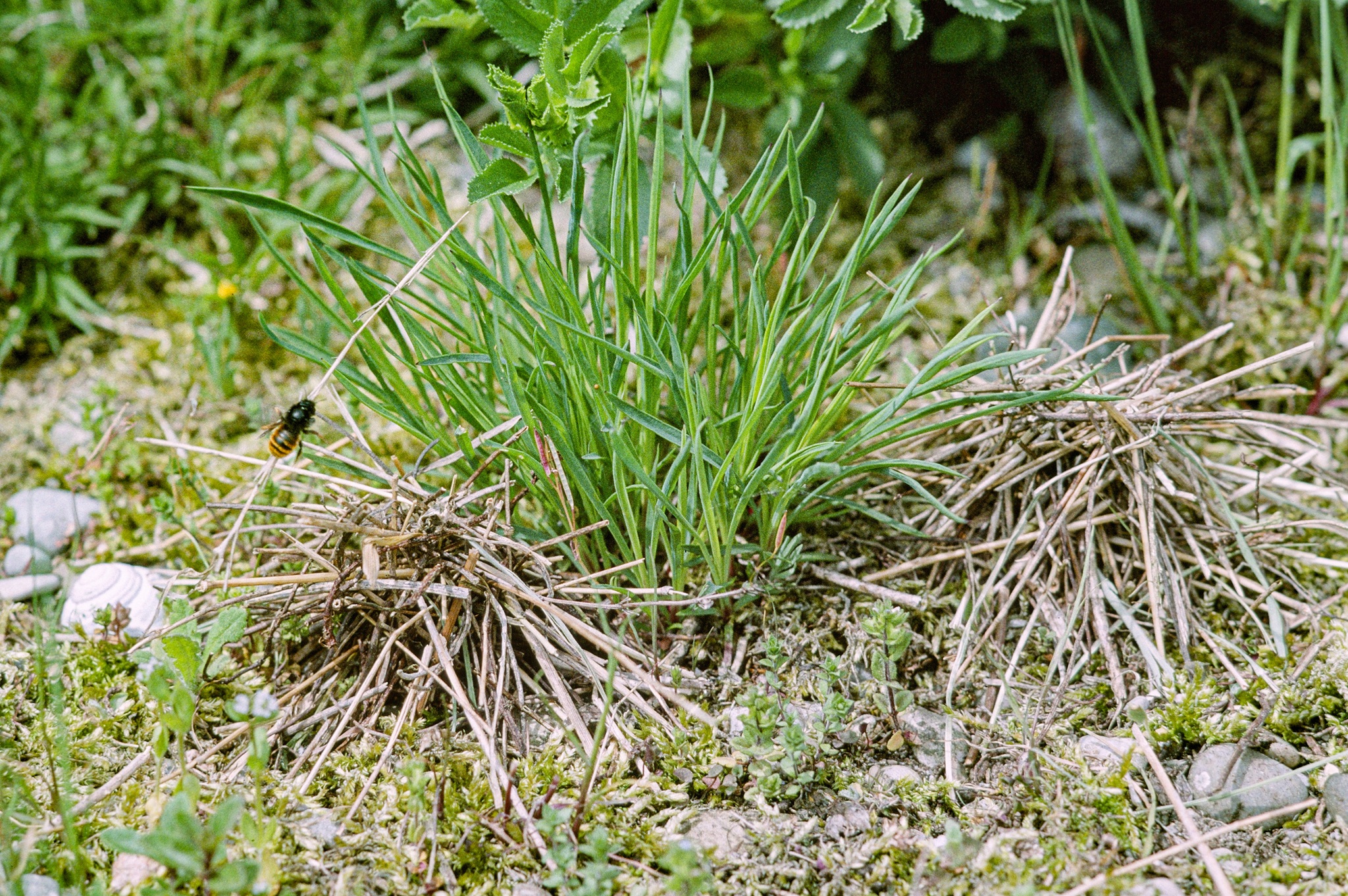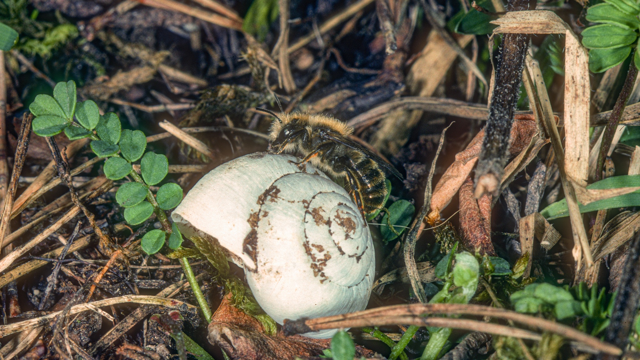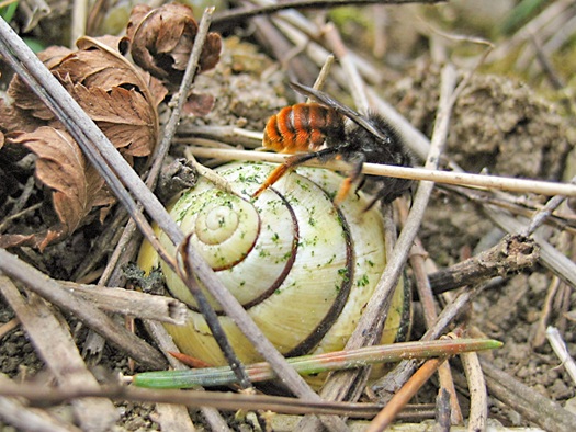 Es ist jedoch nicht das Aussehen der zweifarbigen Schneckenhausbiene, sondern vielmehr ihre unglaublich faszinierende Nist- und Lebensweise, die sie zu etwas ganz Besonderem macht. Denn wie der Name schon vermuten lässt, nistet die zweifarbige Schneckenhausbiene als eine von nur sechs Wildbienenarten tatsächlich ausschließlich in verlassen Schneckenhäusern, wobei besonders Schnirkel-, Strauch- oder Bänderschnecken bevorzugt werden und größere Behausungen, wie die der Weinbergschnecke (Helix pomatia) nur sehr selten angenommen werden. In diesen ungewöhnlichen Behausungen beginnt das bunte Treiben ab Anfang/Mitte März mit dem Schlupf der Männchen, die schon einige Wochen vor den Weibchen aktiv werden und innerhalb ihres Aktionsradius intensiv nach Schneckenhäusern mit schlupfbereiten Weibchen suchen (Abb. 2). Sobald diese geschlüpft sind, kommt es direkt zur Paarung und die gleichermaßen außergewöhnliche wie spektakuläre Brutfürsorge der zweifarbigen Schneckenhausbiene nimmt ihren Lauf.